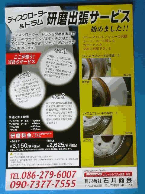 電話するとブレーキ研磨をしに出向いてくれ、その場で研磨してくれます!出張費タダです!!