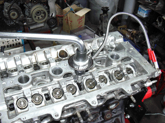 バルブ&バルブスプリング組み込み中 アクリル板を載せ灯油を入れて容量あわせプラマイ0.1cc